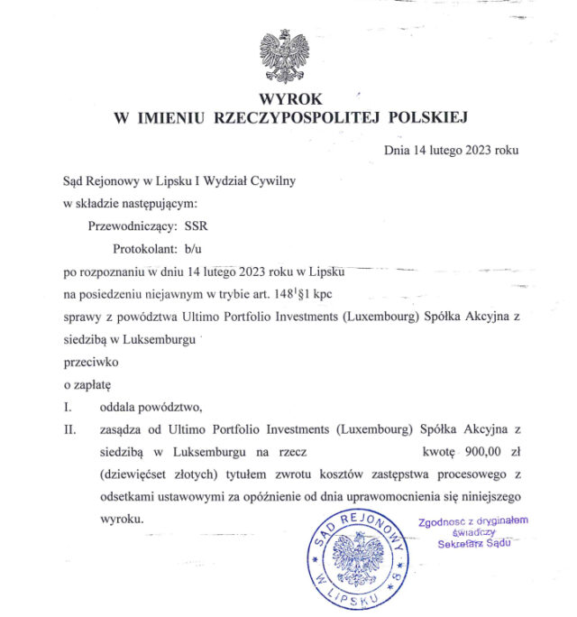 Wygrana w sądzie z Ultimo