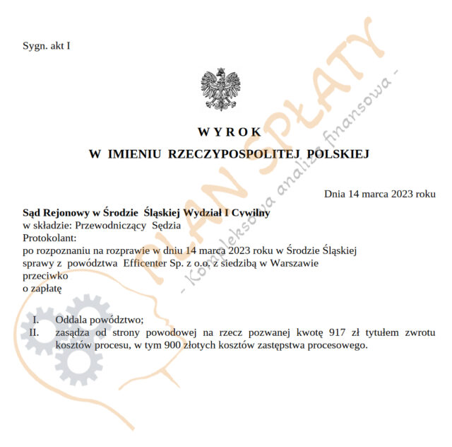Nie tak dawno na blogu opisaliśmy pokrótce, jak działa firma Efficenter i jak poradzić sobie z zadłużeniem w Efficenter. Nie minęło dużo czasu, a możemy opublikować korzystny dla naszej klientki wyrok, który zapadł w sądzie rejonowym w Środzie Śląski...