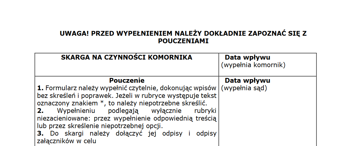 Jeśli mimo jasnych przepisów prawa, które stoją po Twojej stronie, komornik odmawia udzielenia informacji na temat toczącego się postępowania, dłużnik ma prawo złożyć skargę na czynności komornika. Wniosek taki należy złożyć na formularzu, który wypełnia się odpowiednimi danymi i składa w kancelarii komornika. Skarga trafi następnie do sądu rejonowego, przy którym działa dany komornik.