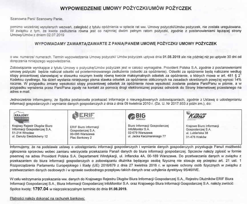 - 4. Wypowiedzenie umowy pożyczki w Provident