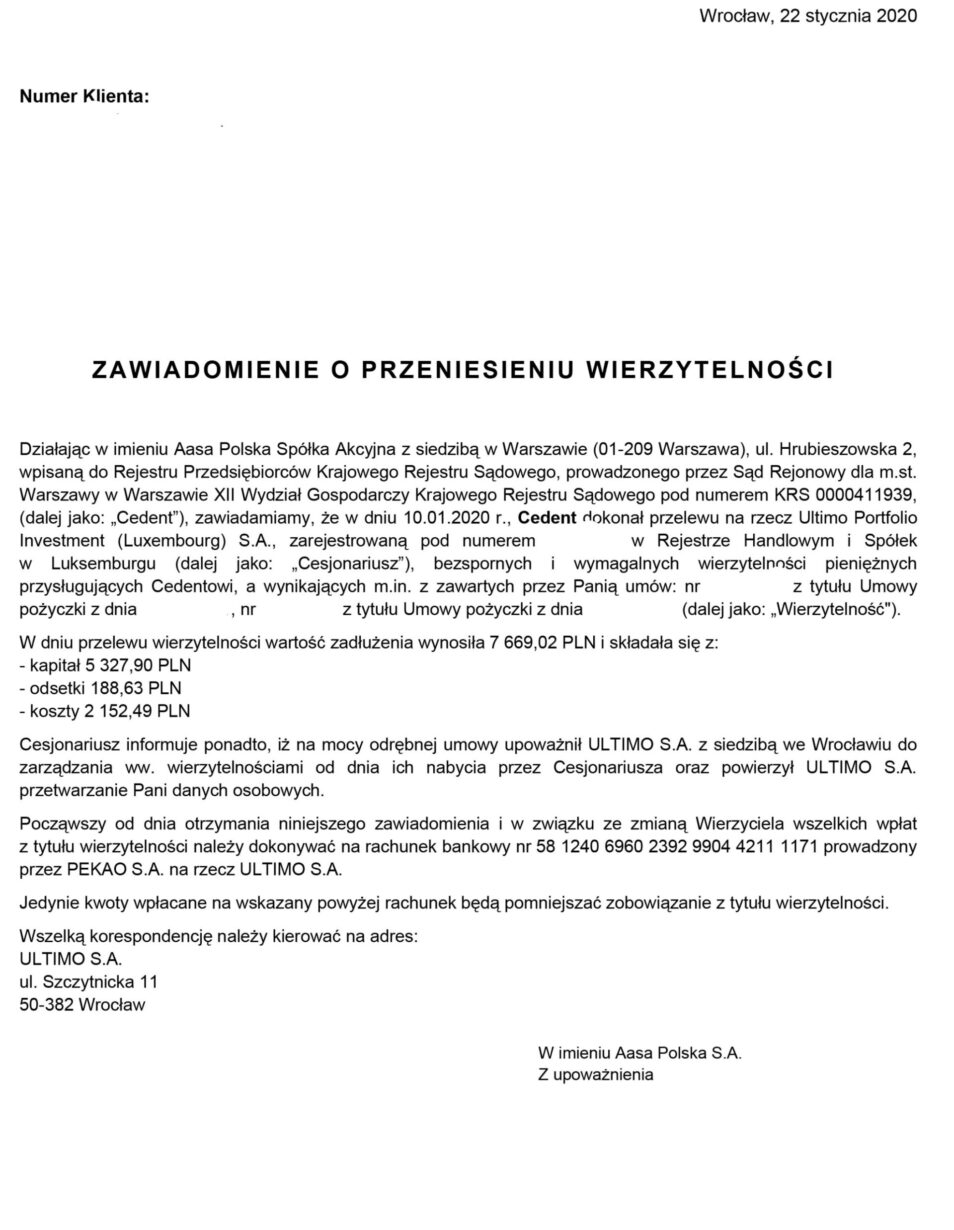 Transakcja, która pozwala na przeniesienie wierzytelności od wierzyciela (zwanej cedentem) do osoby trzeciej (zwanej cesjonariuszem), nazywana jest przelewem wierzytelności. Niezbędne jest dwustronne oświadczenie woli – nie tylko od strony cedenta, ale również od cesjonariusza, który musi zgodzić się na przejęcie wierzytelności. Zgodnie z kodeksem cywilnym, nie jest wymagana zgoda dłużnika na przeprowadzenie takiej operacji (art. 514 k.c.). Pomimo zmiany wierzyciela, status prawny dłużnika nie ulega zmianie w odniesieniu do jego odpowiedzialności. Wierzytelność pozostaje taka sama, jedynie następuje zmiana podmiotu – osoba trzecia (cesjonariusz) zastępuje pierwotnego wierzyciela. Cesjonariusz przejmuje wierzytelność w takim stanie, w jakim była u cedenta. Tym samym dłużnik wobec funduszu Ultimo, może złożyć dokładnie takie same zarzuty, jakie mógłby złożyć wobec pierwotnego wierzyciela.