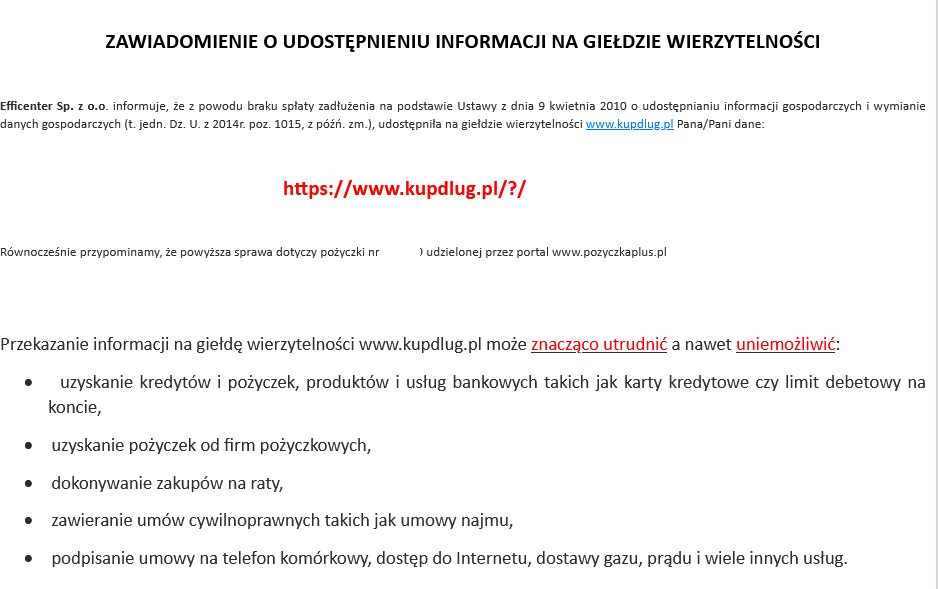 W jednych z mailu dłużnik dostał informację o tym, że jego zadłużenie trafiło na giełdę długów. Efficenter informuje, że taki wpis utrudni dłużnikowi życie, bowiem ten już nie będzie mógł zawierać kolejnych umów kredytowych, czy też dokonywać zakupów na raty. Ba, będzie miał problemy z zawarciem umowy najmu! Na pierwszy rzut oka konsekwencje wydają się poważnie. Ale spójrz na to chłodnym okiem. Czy wpis na stronę internetową, zwaną dla niepoznaki „giełdą” (na takiej stronie nie kupisz żadnego długu!) która jest prowadzona przez prywatnego przedsiębiorcę, ma odnieść jakiś inny skutek, niż uśmiech politowania na Twojej twarzy. Fakt, Twoje imię i nazwisko może być na takiej liście umieszczone (nie sprzeciwiają się temu przepisy RODO), niemniej oprócz tego, że Twoje dane tam trafią, nic więcej się nie stanie