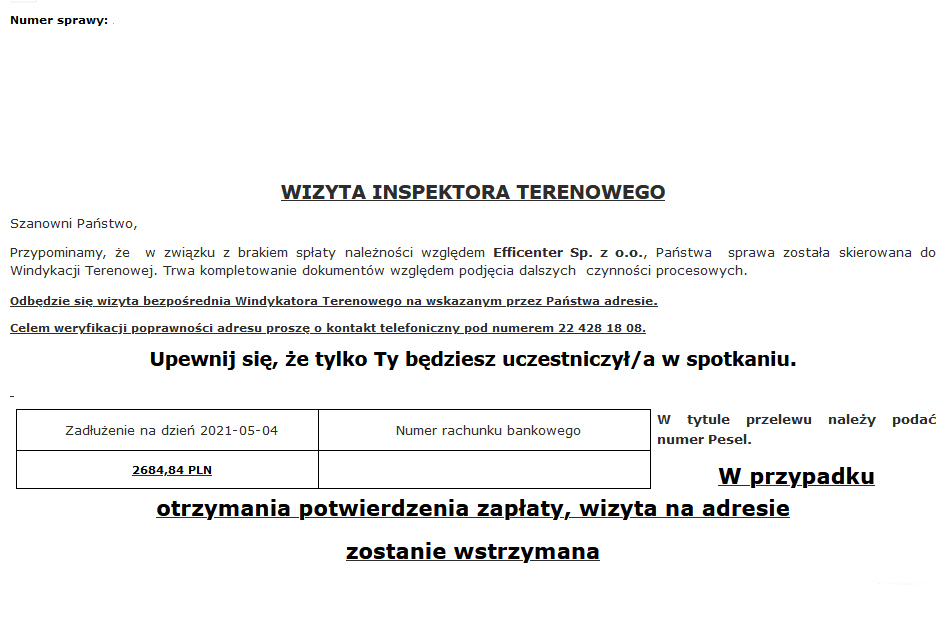Przechodzimy do kolejnego etapu windykacji Efficenter. Dłużnik otrzymał kolejnego maila, tym razem o wizycie inseptora Gadzeżeta, ehkm, inspektora terenowego.