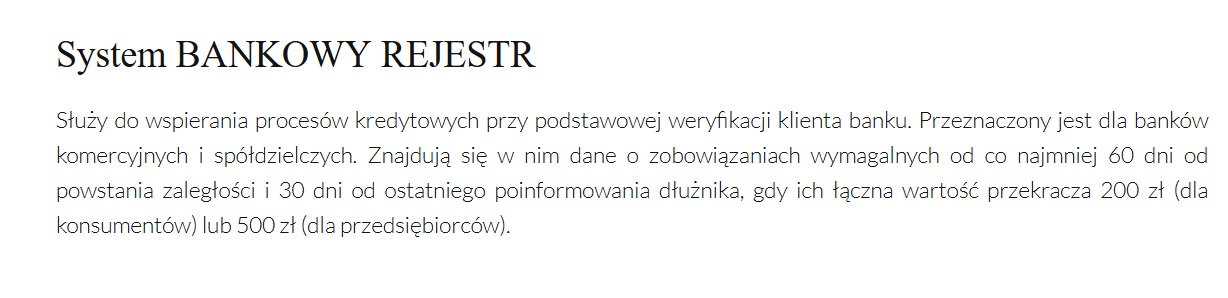 Sprawdź również Bankowy Rejestr, który prowadzony jest przez Związek Banków Polskich. Gromadzone są tam dane dotyczące zobowiązań z sektora bankowego. Czasami może zdarzyć się tak, że mimo wykreślenia negatywnego wpisu w BIK, taki wpis będzie widniał w Bankowym Rejestrze. Ważne jest więc sprawdzenie, czy także w tym rejestrze ujawniono jakieś Twoje zobowiązania.