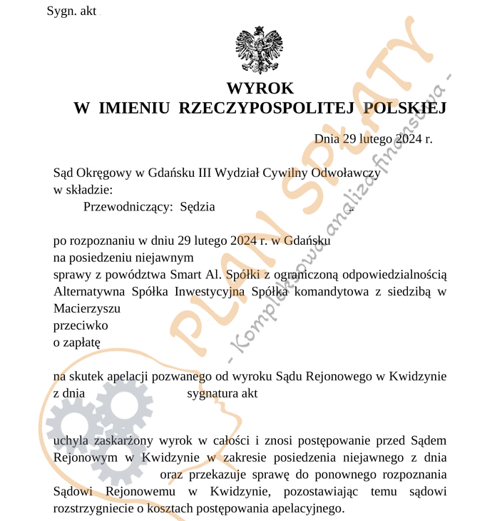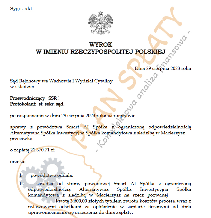 Niestety, ale nikt nie zagwarantuje Ci, że wygrasz w sądzie ze Smart AI. Każda sprawa jest indywidualna, a końcowy sukces w sprawie uzależniony jest od wielu czynników. Dobrze sformułowane zarzuty procesowe pozwolą Ci jednak przybliżyć do sukcesu.