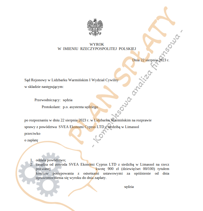 Skuteczna strategia procesowa pełnomocnika, który reprezentował Panią Agnieszkę, doprowadziła do oddalenia powództwa w całości. Sąd Rejonowy uznał, że nowy wierzyciel – spółka SVEA z siedzibą na Cyprze – nie udowodniła, że Pani Agnieszka ma jakikolwiek dług! Tym samym pozew o zwrot kwoty 3746 zł został oddalony w całości, a na rzecz Pani Agnieszki zasądzono zwrot kosztów procesu.