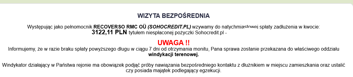 Jeśli otrzymałeś sms, lub wiadomość e-mail, z informacją o nieuchronnie zbliżającej się wizycie windykacji terenowej, to musisz mieć świadomość, że do żadnej wizyty w miejscu Twojego zamieszkania nie dojdzie. Każdy bowiem dłużnik, który dostałby taką informację, albo na czas „wizyty” udawałby, że nie ma go w domu, albo najzwyczajniej w świecie wyszedłby z domu.