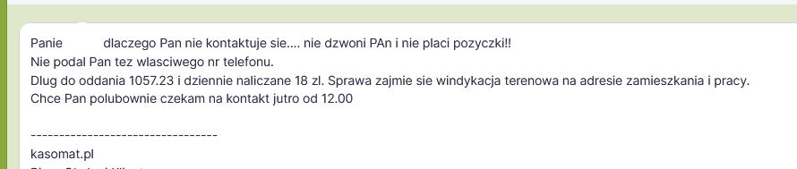 Skoro jednak dłużnik obawia się wizyty dłużnika, tak podobny strach może wywołać sama wiadomość o nadchodzącej wizycie. Niektórzy więc, chcąc mieć święty spokój, biorą kolejną pożyczkę – po to, aby spłacić inny dług i aby odwołać wirtualną wizytę windykatora terenowego!