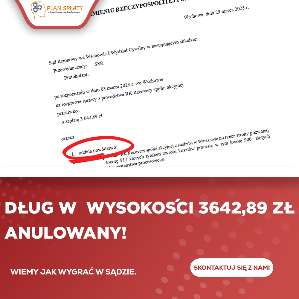 Ostatecznie, nasza argumentacja przekonała sąd, który orzekł na korzyść klientki, oddalając roszczenia RK Recovery. Wyrok ten był dla naszej klientki ogromnym sukcesem, gdyż uwolnił ją od długu i pozwolił na rozpoczęcie nowego etapu życia bez tego ciężaru finansowego!